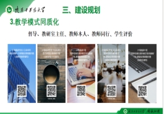 第二部分:着重细化并强调了后期建设规划的重点方向。为了达到同质化考核,对各教学点存在的问题再次强调教学大纲、教学设计、教学PPT等资料的同质化。但在实际操作中,不同带教老师和教学点的教学风格与方法存在差异,如何在不压抑教师个性的前提下,实现这些资料的统一?郭主任提出本学期在教学模式上课模式、上课方式、教学评价同质化,最后提出定期展开交流反馈各教学点教学中的问题并持续改进。