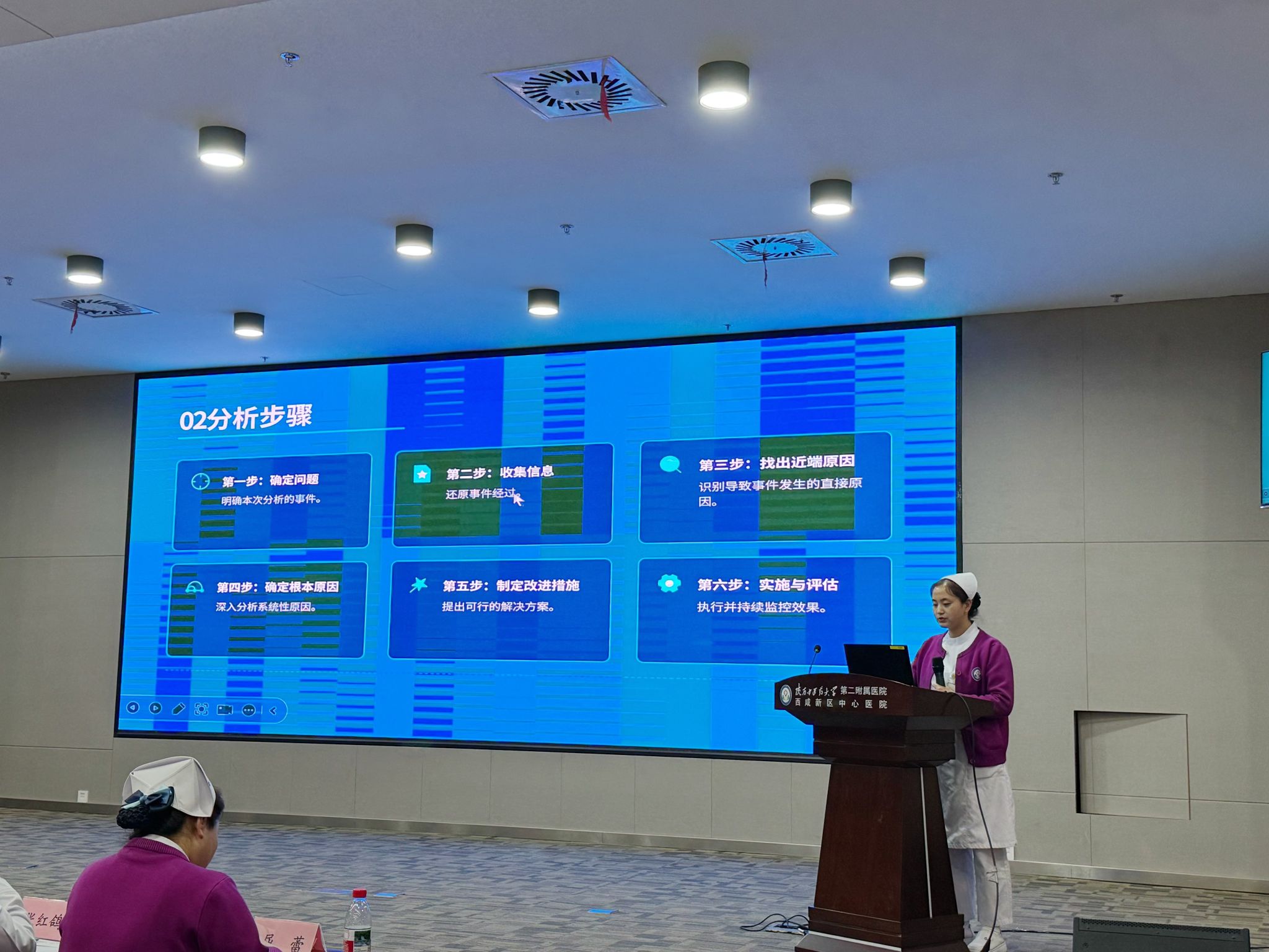 为持续提升妇产儿护理专业水平,推动护理质量与安全管理向科学化、系统化纵深发展。2025年12月31日,我院妇产儿片区成功举办护理根因分析(Root Cause Analysis, RCA)大赛。妇科、产科、儿科等14个科室参与案例展示。护理部主任李莎及各片区总护士长担任评委,各科室护理骨干共计100人参与活动。