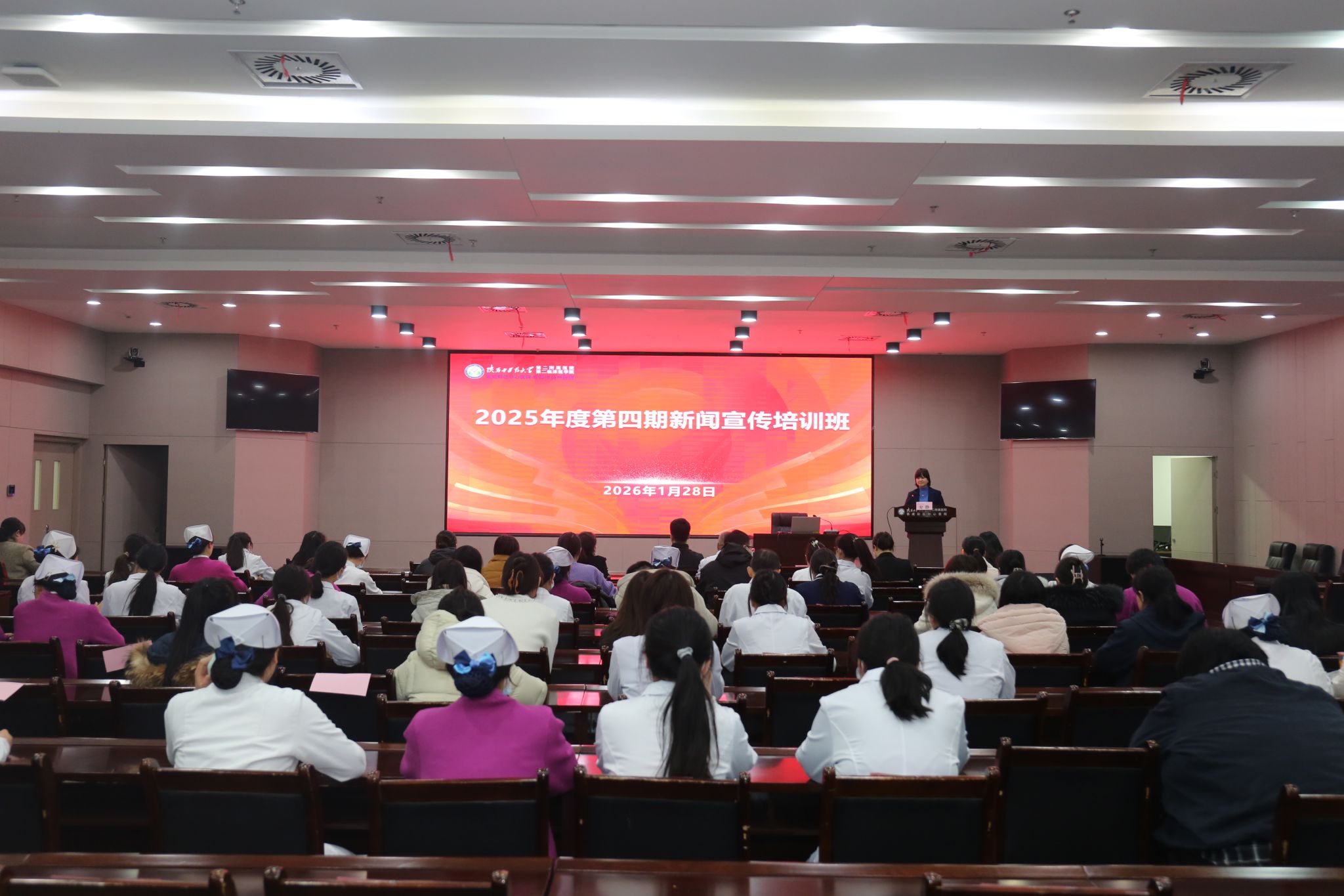 为夯实医院新闻宣传工作基础,提升全体通讯员专业素养与创新能力,2026年1月28日下午,陕西中医药大学第二附属医院2025年度第四期新闻宣传培训班在西咸院区五楼多功能厅举行。培训由宣传部部长安静主持,全体通讯员参会。