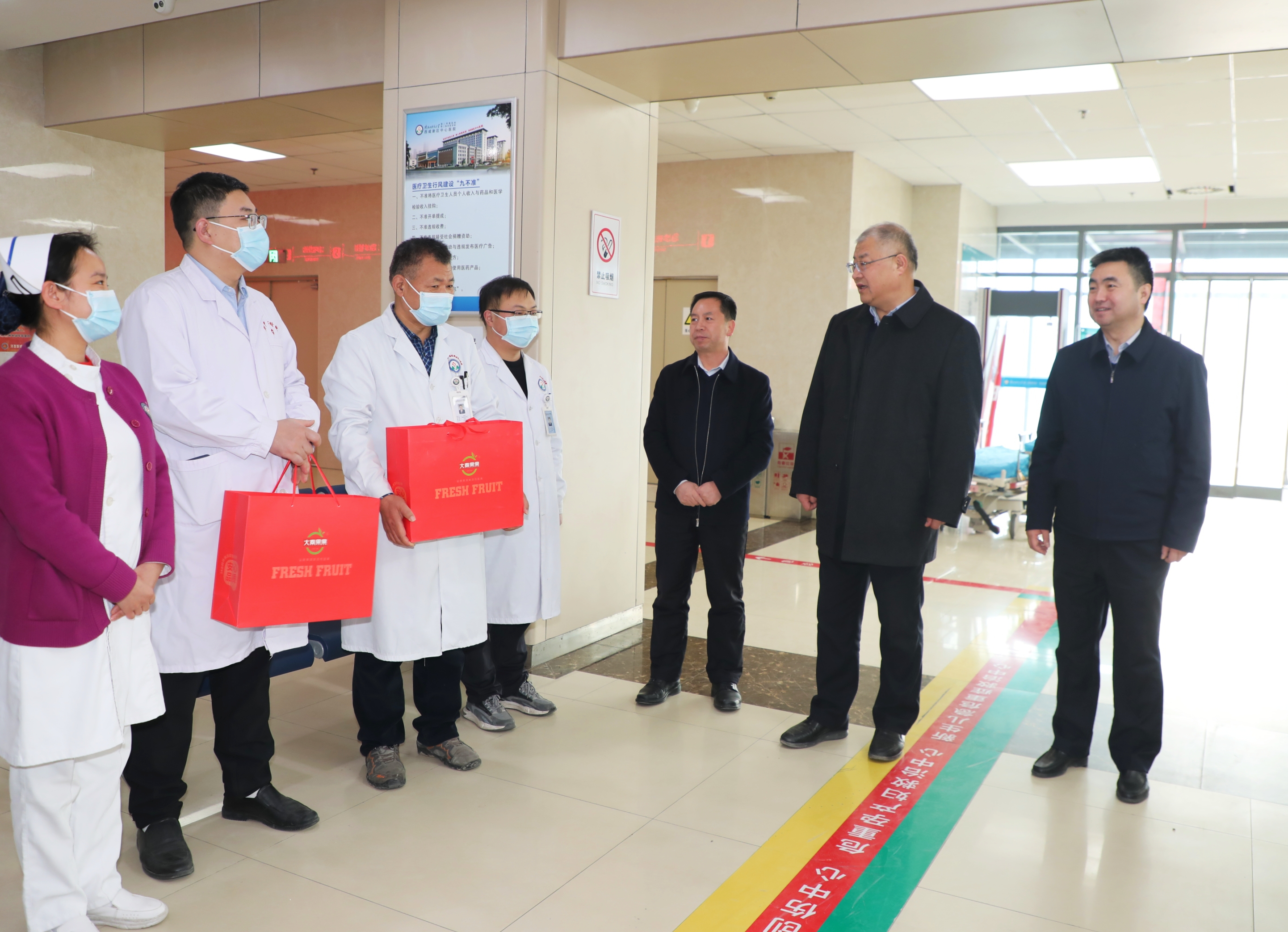2月10日农历大年初一,陕西中医药大学党委书记刘双耀、校长杨晓航、副校长杨景锋、党校办主任李战权一行来到我院西咸院区,走访慰问春节期间仍坚守在工作岗位上的一线值班医护人员。院党委书记寇久社,党委副书记、常务副院长(主持工作)栗文彬及班子成员陪同慰问。